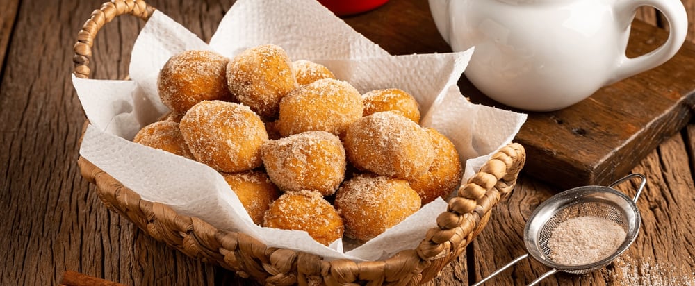 E como toda boa viagem precisa de alimento, o Tio Dinho serve dois quitutes irmãos de alma e distantes no mapa: as frittelle veneziane, típicas do carnaval europeu, perfumadas, leves, polvilhadas de açúcar como se tivessem acabado de sair de um baile em Veneza; e o nosso bolinho de chuva, memória de quintal, de aconchego brasileiro. Dois mundos, uma mesma alegria frita em óleo quente e compartilhada com a mão.
