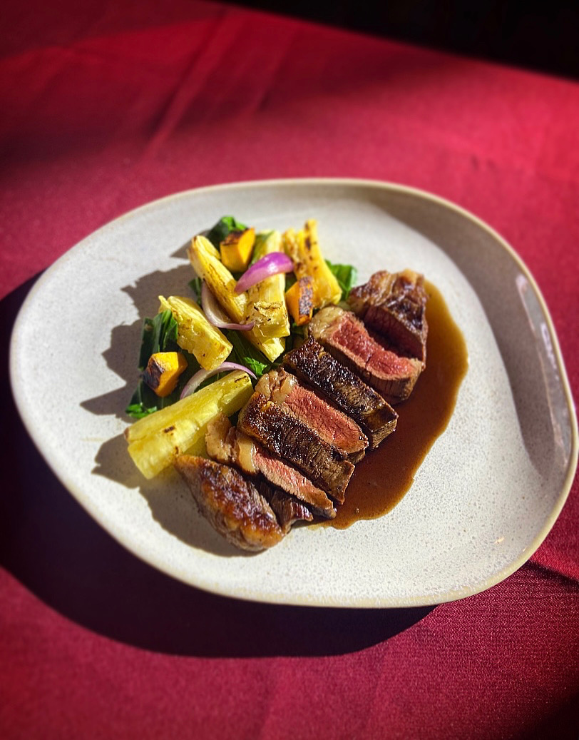 Picanha angus, glace ao vinho tinto, fermentado de repolho roxo e batata inglesa roxa