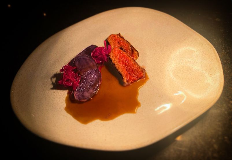 Bife de tira angus, glace de café, fermentado de repolho roxo e batata inglesa roxa