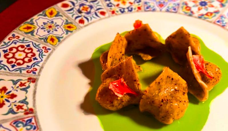 Tortelli à base de fubá de milho criolo vermelho recheado de abóbora em azeite de rúcula, mel de mandaçaia e amendoim tostado