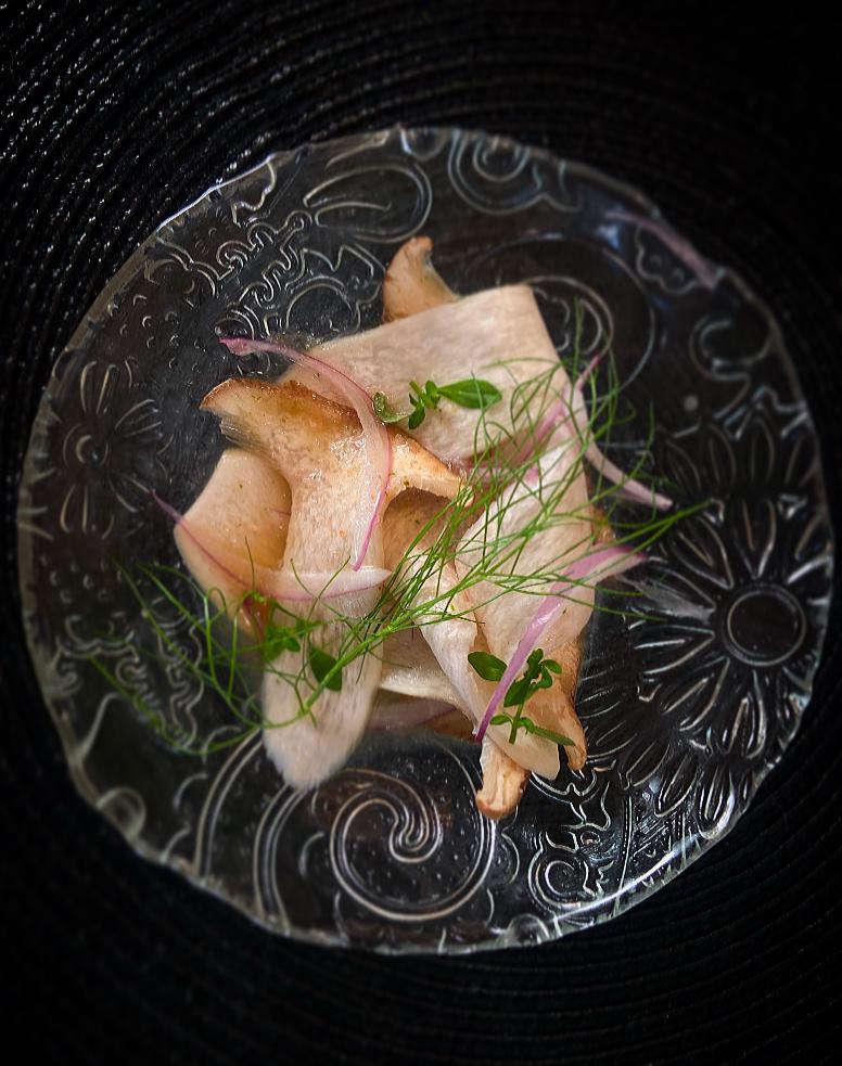 Ceviche de cogumelo eryngui, em leite de tigre de cambuci, pétalas de cebola pérola e poejo