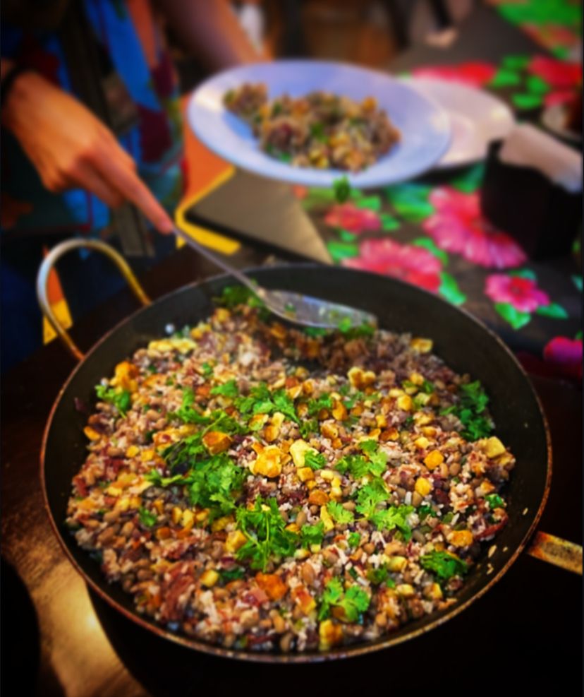 O prato funciona como exercício sensorial e gesto de convivência — onde gordura, acidez e doçura encontram equilíbrio no tempo do fogo e da escuta do ingrediente.