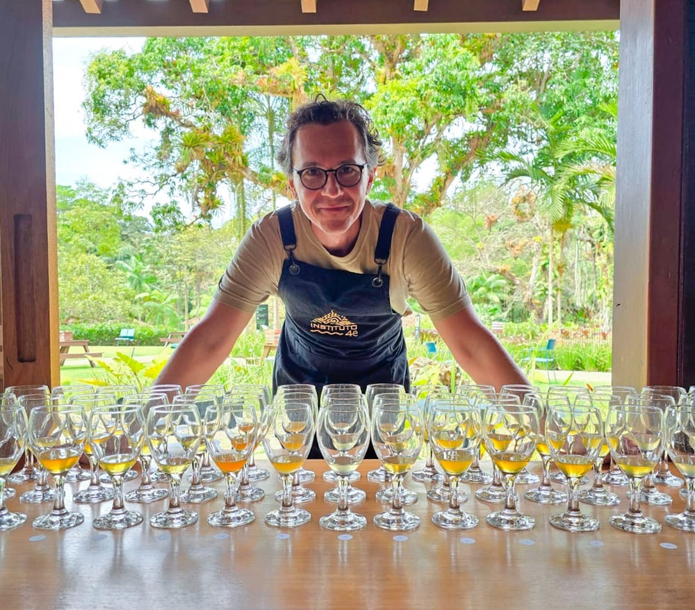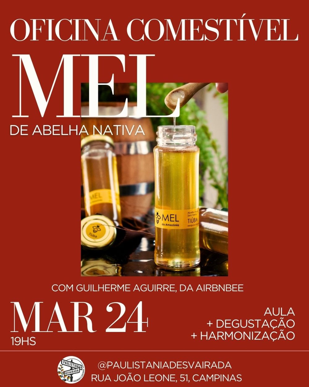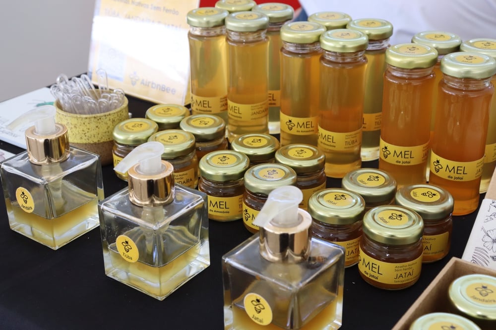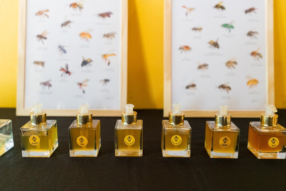 A experiência começa com uma parte teórica conduzida por Guilherme Aguirre, da Airbnbee, que compartilha conhecimentos sobre os meles de abelhas nativas sem ferrão — suas origens, modos de produção, diferenças sensoriais e a relação íntima entre abelhas, flora e paisagem.